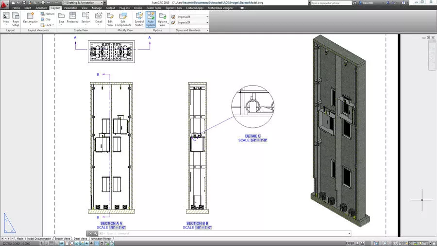 Quando você importa um modelo no AutoCAD 2013, ele gera automaticamente uma documentação baseada nas ferramentas de documentação criadas sobre uma base de experiência de mais de 30 anos. Se seus desenhos incluem sólidos 3d ou superfícies, você pode usar a nova ferramenta de documentação para rapidamente criar desenhos com vistas em 2d dos objetos.